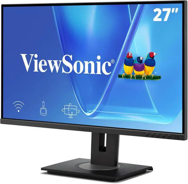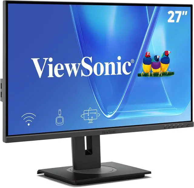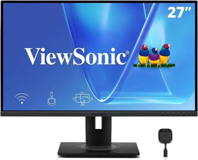The ViewSonic VG2748N monitor delivers a streamlined, cable-free workspace experience. This 27 Full HD IPS display features integrated WiFi technology enabling effortless wireless casting via Miracast and Airplay, while the included ViewShare dongle can support 65W USB-C power delivery when connected to a power sourcekeeping devices charged without extra cables. For added flexibility, the monitor includes HDMI, DisplayPort, and VGA inputs for connecting other devices, along with a built-in USB hub for accessories. An advanced ergonomic stand supports tilt up to 40 degrees, swivel, pivot, and height adjustment for all-day comfort.