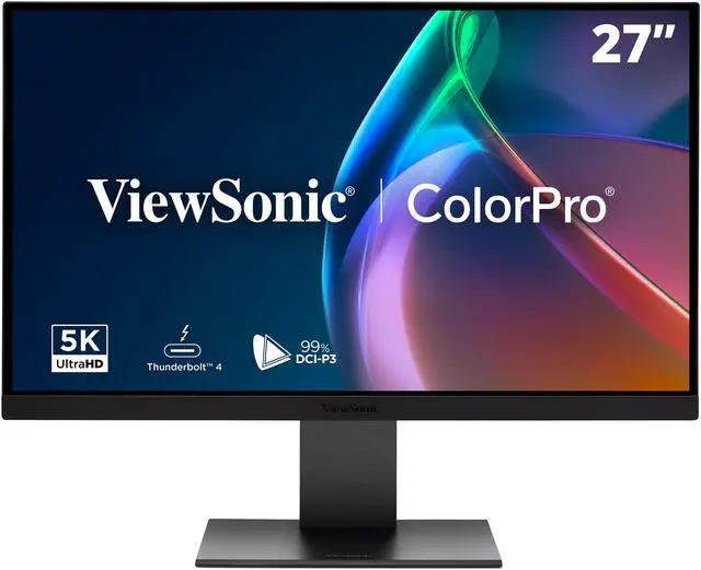 Elevate your MacBook experience with the powerful ViewSonic ColorPro® VP2788-5K, a sleek 27 monitor designed to integrate seamlessly into your Mac or PC ecosystem. Featuring stunning 5K (5120x2880) resolution and a 99% DCI-P3 color gamut, it provides vibrant and precise visuals to complement Apples renowned color performance. Seamless Thunderbolt 4 connectivity provides ultra-fast data transfer and up to 100W charging through a single cable, while also supporting daisy chaining of up to two 5K monitors for a seamless multi-display setup. Additional HDMI and DisplayPort options offer unmatched flexibility for various devices. In addition, an integrated USB-C and USB-A hub allows for connecting accessories and quick charging of your iPhone or iPad.