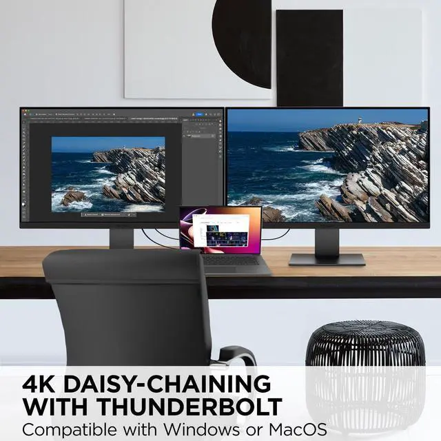 The VP3276T-4K ColorPro Monitor is a professional-grade display engineered for creative excellence, offering stunning 4K resolution, precise DCI-P3 color accuracy, and HDR400 for an immersive visual experience. With integrated docking monitor features, including Thunderbolt 4 with 100W of power delivery, RJ45 Ethernet, and multiple connectivity options such as DisplayPort, HDMI, and a USB hub, it simplifies your workspace while ensuring stable performance. Thunderbolt technology allows this monitor to support dual 4K daisy chaining, allowing you to extend your display setup seamlessly for enhanced productivity.
