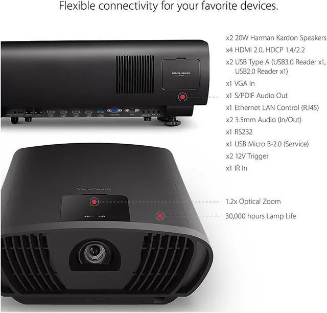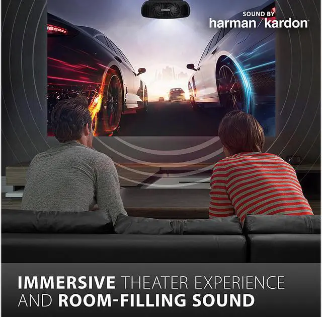 PREMIUM AUDIO: An efficient airflow design reduces fan noise and keeps the projector quiet, while Dual Harman Kardon speakers deliver vibrant room-filling sound