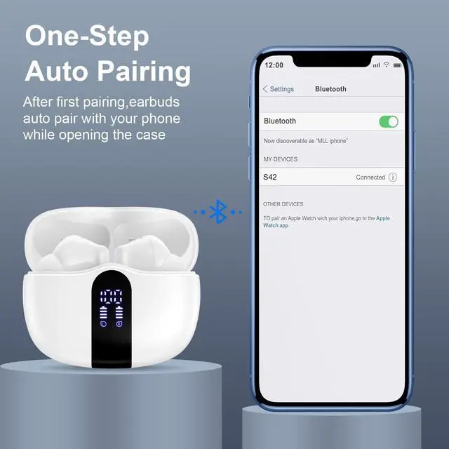 Wireless earbuds features a magnetic Hall-effect switch, just open the charging box, the headset will automatically turn on and connect to phone after initially connected.