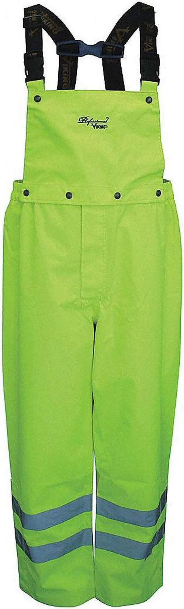 Hi-Visibility Rain Bib Pants, Style Bib Pant, Material Polyester, Gender Men's, Size XL, Color Green/Yellow, Inseam 32 1/2 in, Maximum Waist Size 39 in, High-Visibility Yes, ANSI Class E, Number of Inside Pockets 1, Number of Outside Pockets 0, Includes Lining Yes, Lining Material Polyurethane, Ankle Type Adjustable Cuff, Fabric Weight 13.5 oz, Fly Closure Type Hook-and-Loop, Standards ANSI/ISEA 107-2015 Class E, CSA Z96-15 Class 2, Level 2, not FR, Waist Closure Snaps, Will Fit Over Boots Yes.