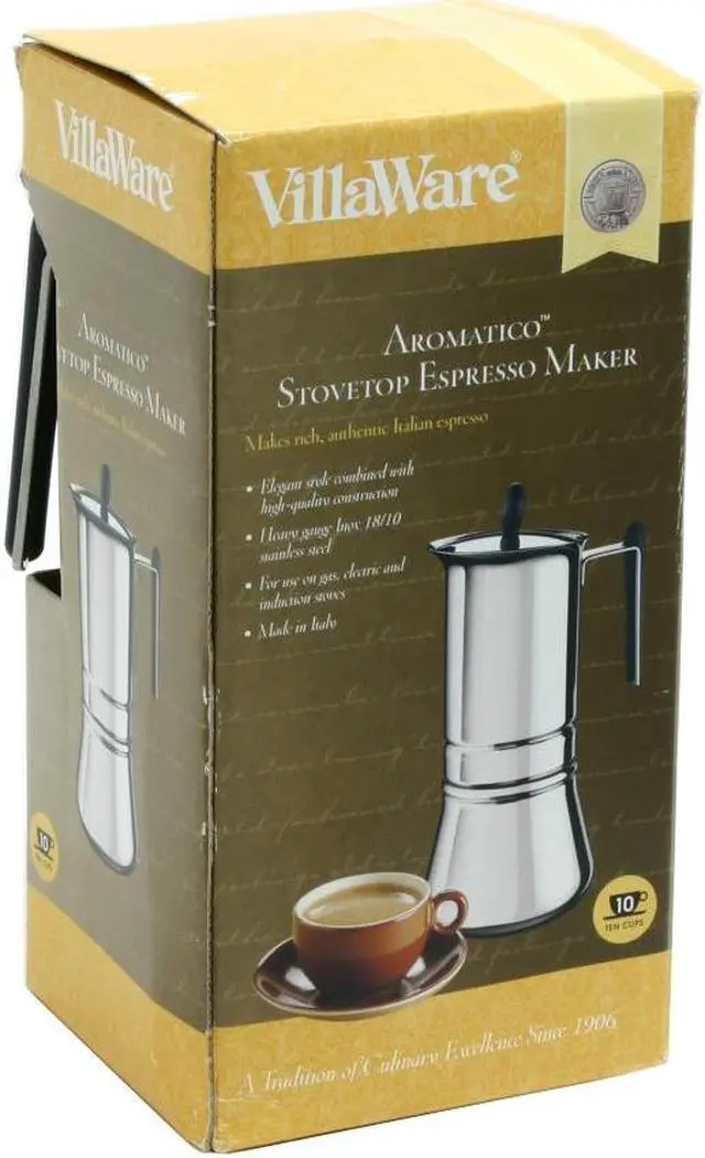 Make Great CoffeeThe aluminum VillaWare V003-41810 stovetop Espresso maker is made of heavy gauge stainless steel for durability and to diffuse heat evenly for enhanced coffee aroma.