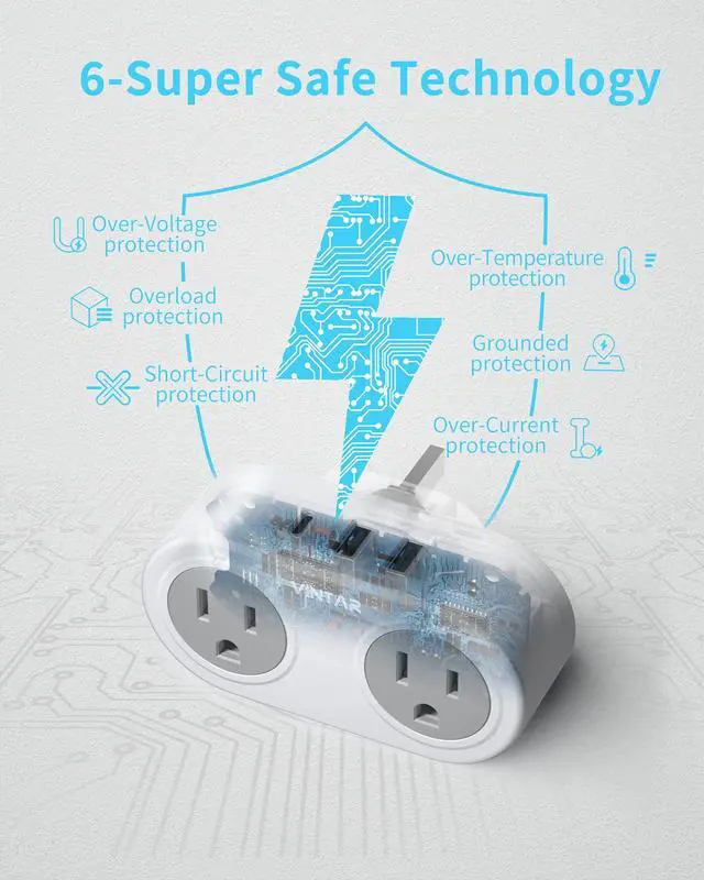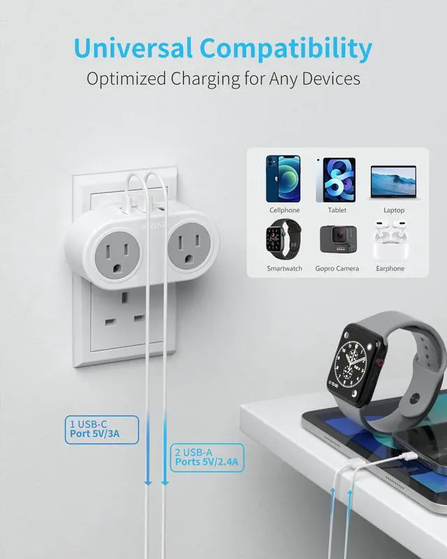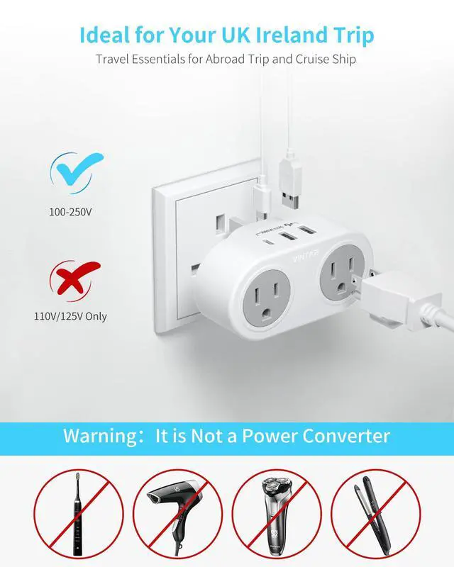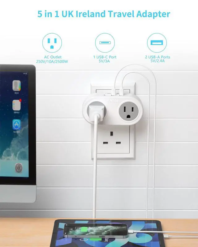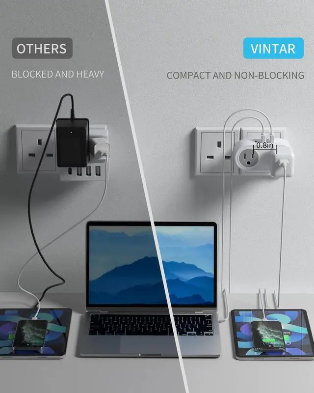 This type G Adaptercan charging 5 devices simultaneously, wide space of 2 outlets reach 1.5 inch,easily plug in 2 bulky plugs at the same time.