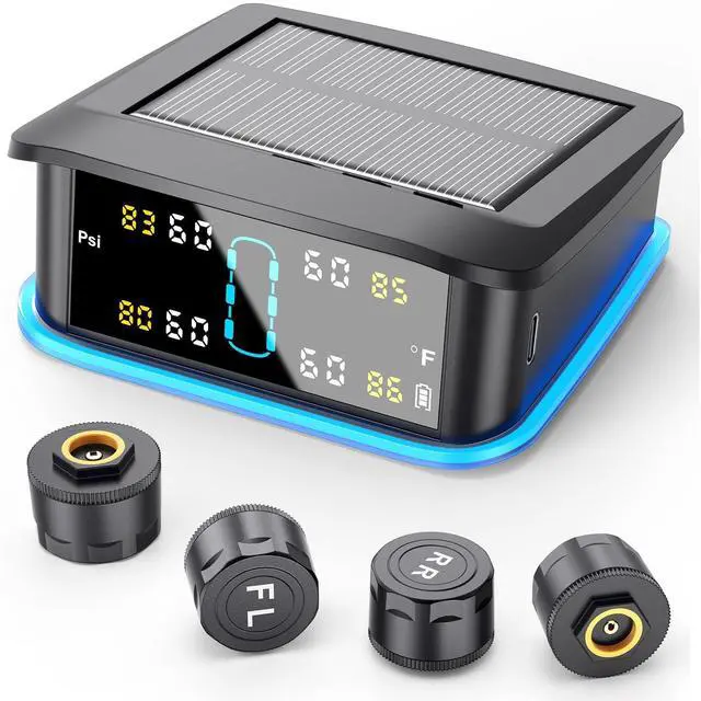 Tire Pressure Monitoring System, Real-time Solar Wireless TPMS with 4 Tire Pressure Sensor, Digital LCD Display, Auto Security Alarm for RV SUV MPV Truck Sedan