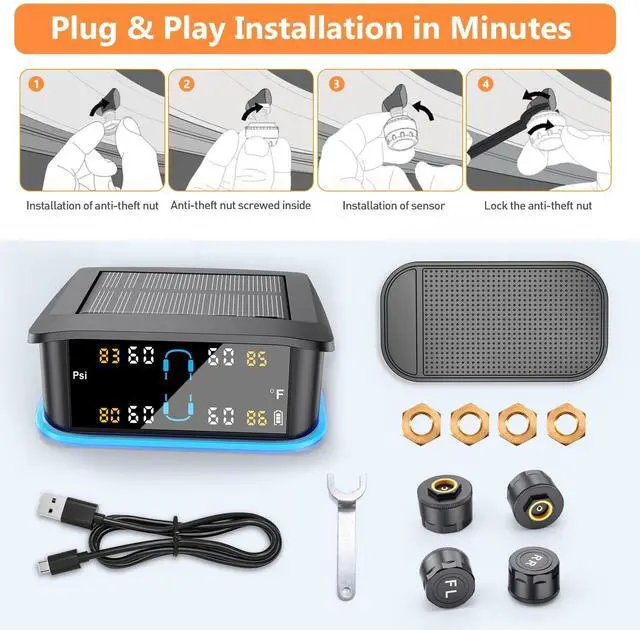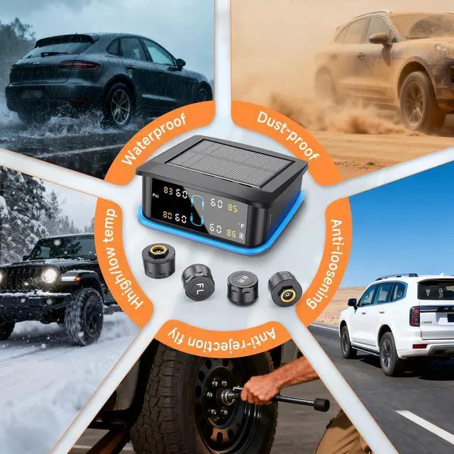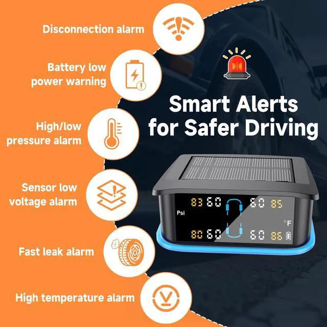 [Six Alarm Modes for Your Safety]: The GEARGO Tire Pressure Monitoring System (TPMS) offers five different alarm modes, covering rapid leak detection, high/low pressure alarms, high temperature warnings, and sensor low voltage/signal loss notifications. After pairing, the system automatically configures the current tire pressure as a reference value, ensuring your travel safety.