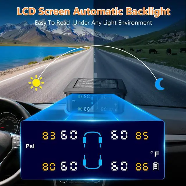 [Efficient Energy Saving and Accurate Data Reading]: The TPMS features an energy-saving mode and four advanced external sensors known for their low power consumption (up to six months on a single CR1632 battery) and long lifespan (up to two years). These sensors are waterproof (IP67), snowproof, dustproof, and provide highly accurate tire pressure readings with minimal error (approximately 3 psi).