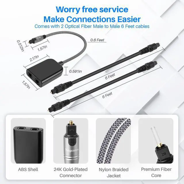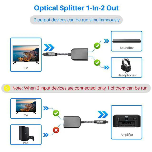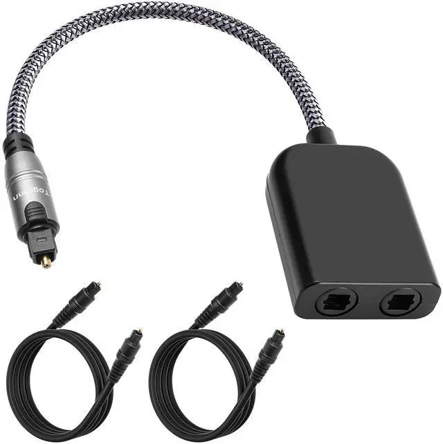 Digital Optical Adapter Splitter 1 in 2 Out, Toslink Digital Audio Fiber Optic Cable Splitter 1x2 for Soundbar, Headphones,TVs -with 2 Optical Audio Cables 6 Feet