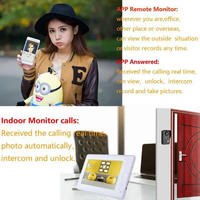 Easy installation by yourself with the adapter and cable we provided in this kit,outdoor unit can connect to indoor monitor by wired 6P cable.When indoor monitor connected to your wireless wifi router,you can connect mobile phone to indoor monitor,then mobile phone also can record video or open the door etc.Widely used in villas, apartments, houses, hotels, offices, public buildings and so on.