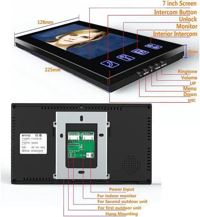 1. 7 inch Ultra-slim design indoor monitor, nice and luxurious, available for wall-mounted.25 kinds of door bell rings, ring volume, chroma and brightness adjustable