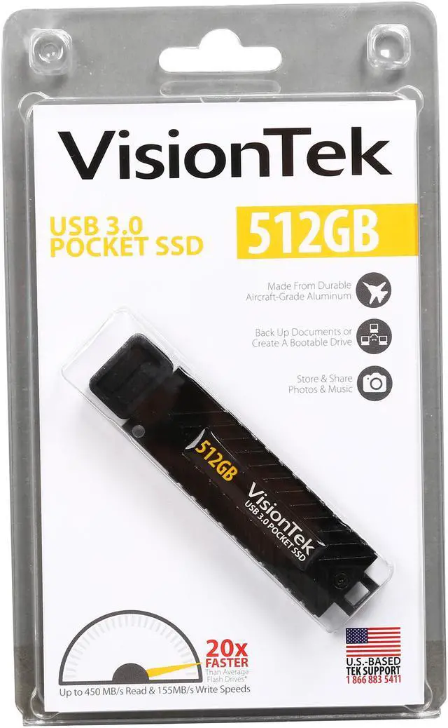 | Features | Transfer speeds approximately 20 times faster than standard USB 2.0 Flash Drives.* Up To 450 MB/s read and 150MB/s write speeds. USB 3.0 Plug and Play compatible with LED usage indicator. Aircraft Grade aluminum enclosure for ultimate durability. Designed and built in the North America with the highest quality components and backed by free lifetime US-based Tek support. TAA Compliant: Assures government contractors and government buyers this product is in compliance with the Trade Agreements Act. |