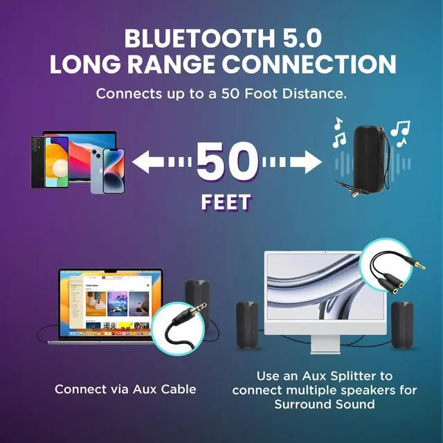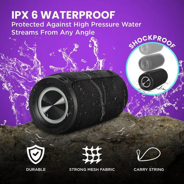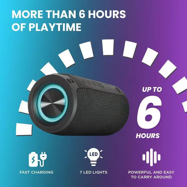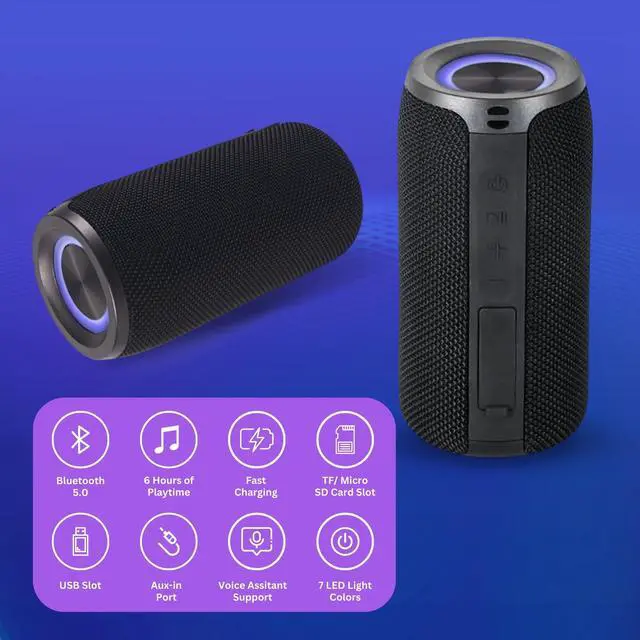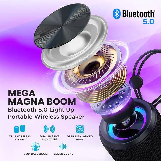 Introducing the Mega Magnaboom wireless bluetooth speaker, where compact size meets colossal sound, ensuring your music experience is anything but ordinary. Don't be fooled by its small stature this music speaker powerhouse delivers a strong, clear sound that sets the stage for unforgettable moments. Immerse yourself in a 360° audio experience, thanks to the cutting-edge wireless BT 5.0 technology, providing an instant and stable connection within a 50 foot range. Concert-quality sound that fills every corner of the room with a strong, reverberating, deep bass. Don't compromise on sound quality, the bluetooth speaker waterproof boasts a strong 1800mAh battery, delivering a continuous 6 hours of playtime and a faster charging experience. But that's not all our portable bluetooth speakers waterproof is ready for action wherever you take it. With an IP6 waterproof rating, it's perfect for poolside parties, beach outings, or outdoor adventures. The rugged construction is drop-proof and dust-resistant, ensuring durability without sacrificing style. Enhance your gatherings with the best bluetooth speaker versatile features. Connect effortlessly with BT, enjoy hands-free calling, and make use of the TF memory card slot, USB, and Aux inputs. The mini bluetooth speaker is also compatible with voice assistants, providing convenient control at your fingertips. Take the party to the next level with the easy-carry strap and seven alternating LED light options. Its lightweight and portable design ensure you can bring the festivities anywhere. Experience a truly immersive audio experience by connecting multiple speakers through an aux splitter and aux cables (sold separately). Don't settle for the ordinary elevate your music experience with the Mega Magna Boom Portable Bluetooth Speaker. Small in size, big on sound, it's the ultimate companion for those who demand excellence from their audio gear.