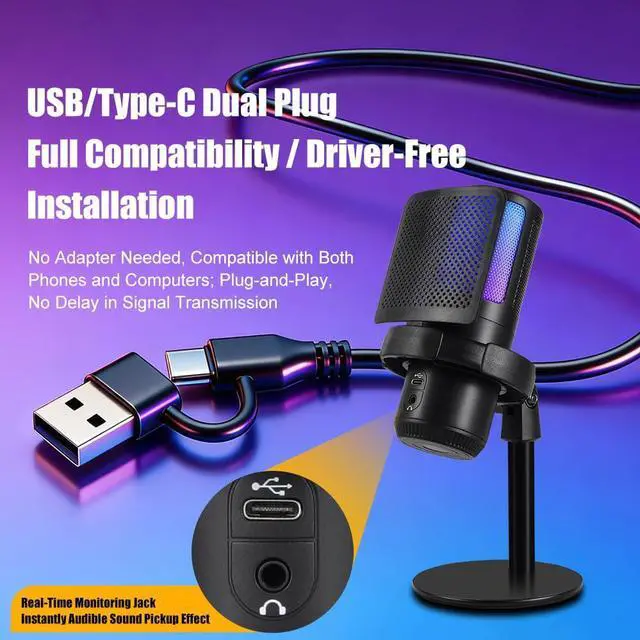 Wide Compatibility & Multi-Scene UseSupports USB/TypeC plug-and-play for phones, computers and game consoles. The anti-wind foam cover reduces unwanted noise. It fits most mic stands and boom arms, ideal for gaming, recording, meetings and home studio use.