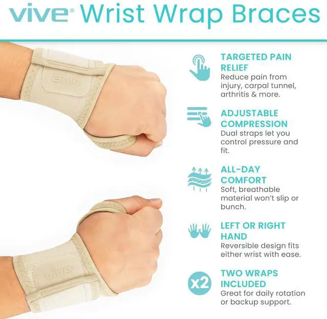COMFORTABLE ALL-DAY SUPPORT: Ideal for sprains, tendonitis, tendinopathy, sports injury and arthritis, the Vive wrist wraps envelop the wrists in soothing compression and provides moderate support to stabilize the wrists. The flexible wrist wraps allow you to exercise, drive, type and complete everyday tasks with ease.