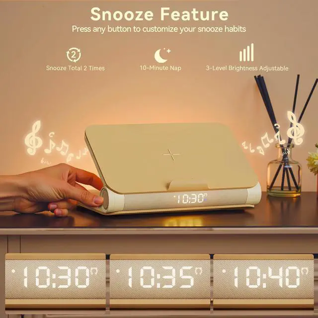 Sunrise Wake-Up Light & Snooze Mode: Start your day with our vivilumens sunrise alarm clock. The light gradually brightens 15, 10, or 5 minutes before the alarm goes off, transitioning through 3 levels of warm light to simulate a natural sunrise. With 0-16 volume levels, you can customize the alarm to your preferred sound . When the alarm rings, press the button to activate the snooze mode. The snooze function allows the alarm to sound every 5 minutes, giving you an extra 10 minutes of sleep