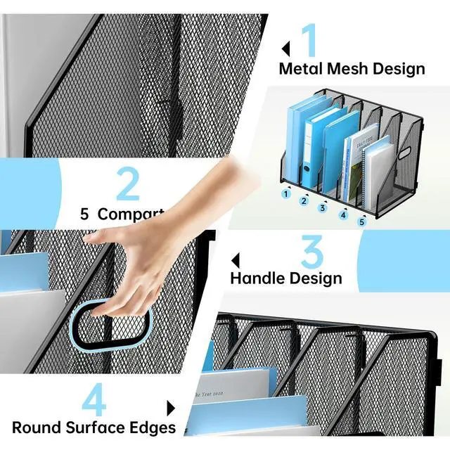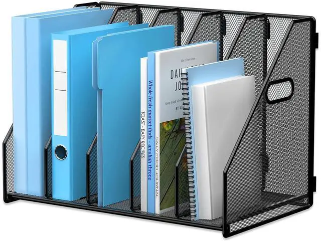 Desk File Organizer Metal Desk Magazine Folder Holder with 5 Vertical Compartments Rack File Organizer for Office, Home, School, Black