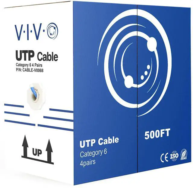 Cat6 UTP (unshielded twisted pair) CCA (Copper Clad Aluminum) 23 AWG bulk ethernet cable in easy to use pull box is ideal for your network installation. Case contains 500 ft of wire with a blue jacket. This unshielded cable comes in its own spool box and is connector-free, giving the user the freedom to customize the length, wiring, and application.