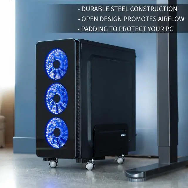 Mobile adjustable PC stand (CART-PC01) from VIVO. Increase the ease of mobility of your computer with this solidly constructed PC cart which features four caster wheels for easy access (two are lockable to keep the cart stationary when desired). Along with its high grade steel material able to hold up to 22 pounds, the frame has a powder coated finish and features inside padding to protect your PC from scratches. The cart comes in a matte black finish, maintaining a low profile and blending in well with a majority of environments.