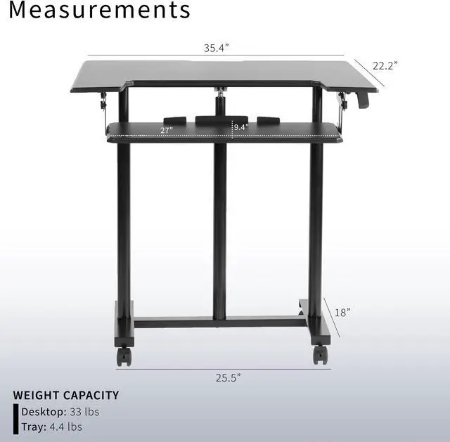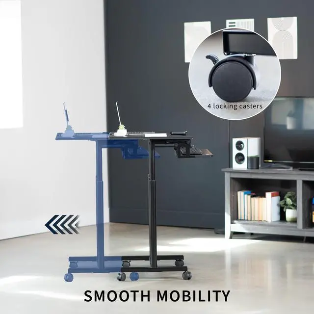 Take your adjustable workstation wherever you want to go with mobile desk cart (CART-V06A) from VIVO! Four durable 2.5" casters provide quick and smooth mobility, and all the casters are lockable for excellent stability when the cart is stationary. Constructed of high-grade steel, this workstations desktop is able to support up to 33 pounds, keeping your expensive equipment safe and secure. Featuring over 16 inches of tension spring height adjustment along 3 solid support bars, a spacious desktop allowing room for your preferred setup, and a sliding keyboard tray for ultimate convenience, this cart was made to perform. All of the necessary hardware and instructions are provided to get your cart assembled in no time!