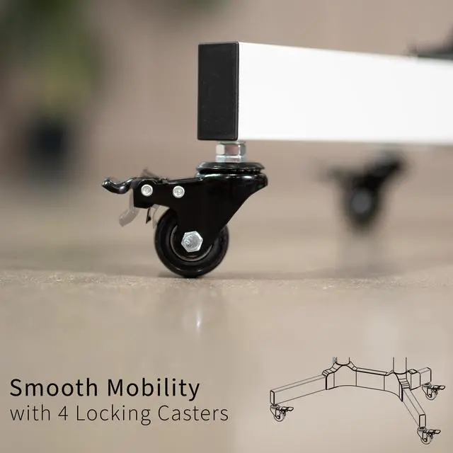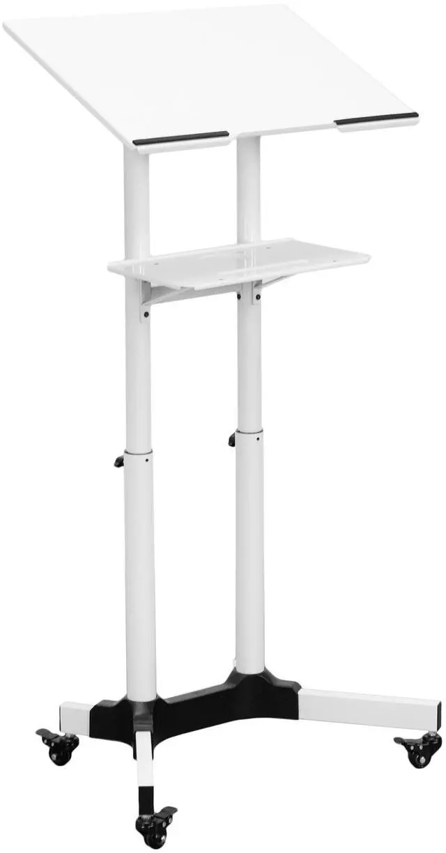Take your adjustable podium or mobile laptop cart wherever you want to go with White 24" Multi-Purpose Mobile Podium (CART-V03W) from VIVO! Four durable 3 casters provide quick and smooth mobility, and all are lockable for excellent stability when you want the cart to be stationary. Constructed of high-grade steel, this carts desktop is able to support up to 44 pounds, keeping your equipment safe and secure. Featuring over 8 inches of height adjustment, a space-efficient tilting desktop, and a lower storage tray for small accessories, this cart is ready to roll. All of the necessary hardware and instructions are provided to get your workstation assembled in no time!