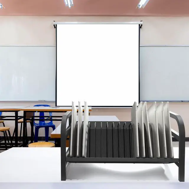 Store and charge multiple laptops at once with the Black 16-Device Open Charging Station (STAND-LAPC3) from VIVO! Featuring 16 built-in outlets and charging bays, this tabletop laptop holder is the perfect classroom or office accessory. Only 13.4 in height, its space-efficient and easy to reach, making tablet storage fast and simple. The low-profile design fits on counters, desks, and tables to save floor space.
