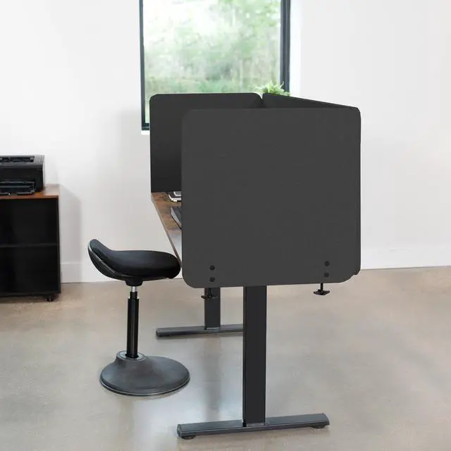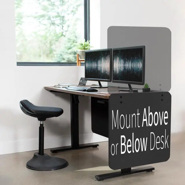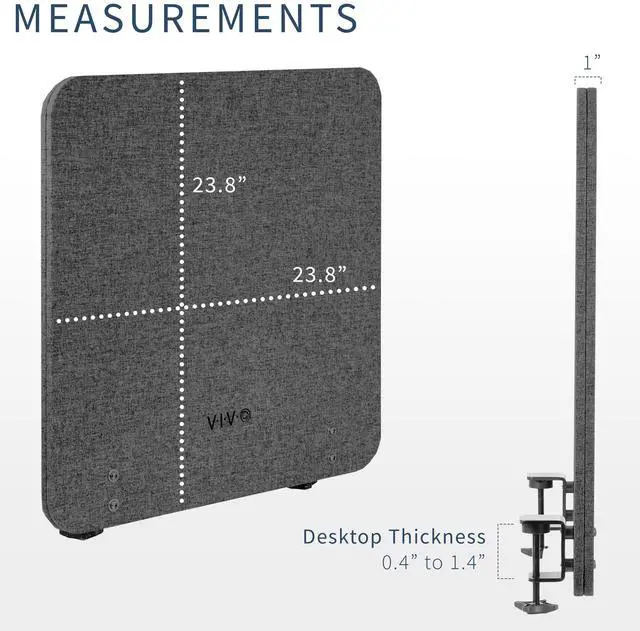 Create much needed privacy and limit distractions with Dark Gray 24 x 24 Clamp-on/Screw-on Desk Privacy Panel (PP-1-V024D) from VIVO! Whether youre wanting to divide one work area into two sections or simply reduce distractions at your workstation, this divider will get the job done by attaching to desks 0.4 to 1.4 in thickness. Sound reducing material makes it easier to concentrate on your work, even when times get loud. And if your desk is located in a high traffic area, you can enjoy the added privacy that a 24 high panel provides. Customize your space to let creativity flow, using the tackable material to pin up photos, fun quotes, to-do lists, and more. All the necessary hardware and instructions are provided to get your new panel mounted and transforming your workspace in no time!