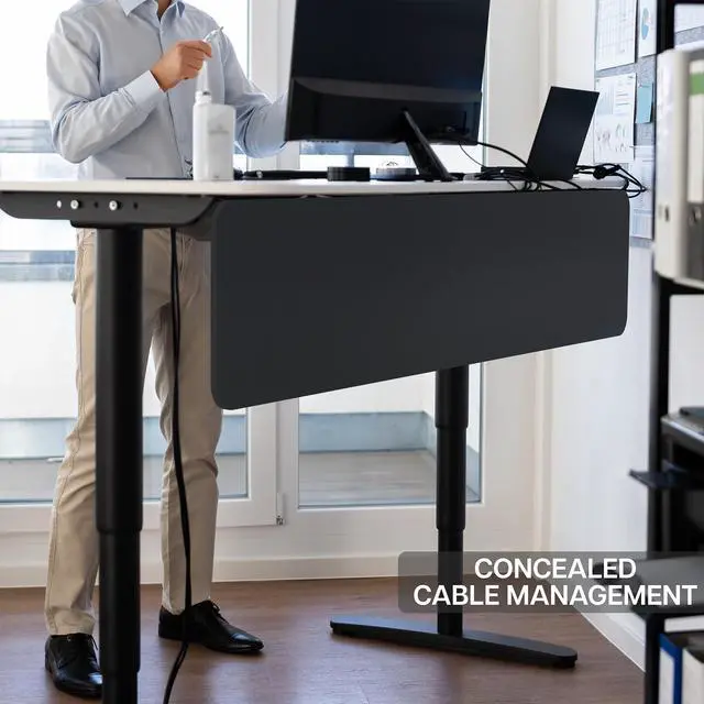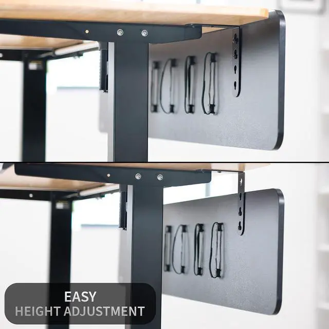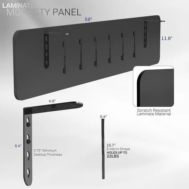 Increase organization at your workstation with the Black Laminate Modesty Panel (PP-LM60-B) from VIVO! Providing both privacy and cable management, this panel installs to the underside of your desktop for seamless integration with your table. Velcro straps make cable routing quick and easy, supporting AV cords, ethernet wires, power strips, surge protectors, and more. The installation manual provides instructions for 3 orientation options (protruded, flush, or inset), and the mounting bracket has 3 height settings to accommodate your desired setup.