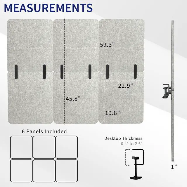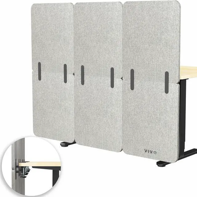 Create much-needed privacy and limit distractions with the Gray Full Height Clamp-on Desk Privacy Panels (x3) (PP-3-C060G) from VIVO! Whether you want to divide one work area into two sections or simply reduce distractions at your workstation, this divider will get the job done by attaching to desks 0.4 to 2.5 in thickness. If your desk is located in a high-traffic area, you can enjoy the added privacy of both above and below desk coverage. Customize your space to let the creativity flow, using the tackable material to pin up photos, fun quotes, to-do lists, and more. All hardware and instructions are provided to get your new panel system mounted in no time!