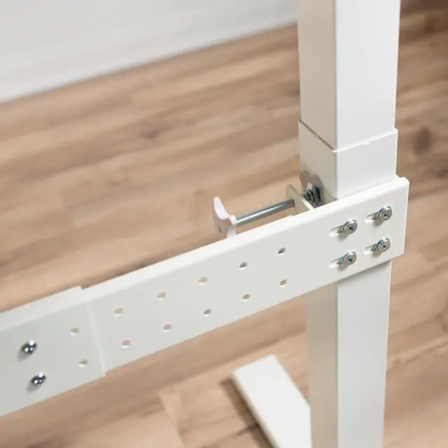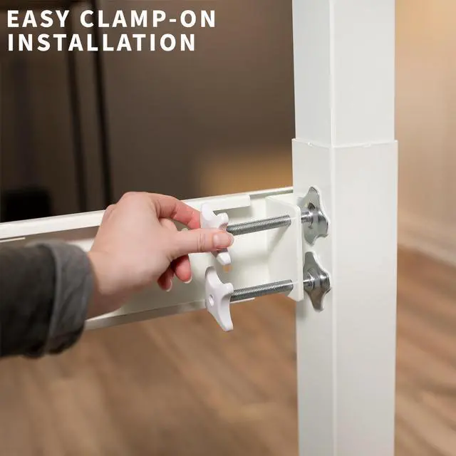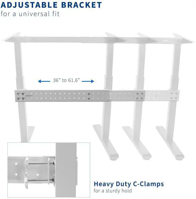 Increase the stability of your standing desk frame with White Clamp-on Support Bar (DESK-STB01W) from VIVO! Designed to fit most two leg desk frames on the market, this product features an adjustable length ranging from 36" to 61.6" to accommodate your current frame. If your standing workstation is top heavy and wobbles or shifts during transitions, this support bar is the solution for you! Simply use the two heavy-duty C-clamps to attach the bar to your frame and enjoy the stabilizing effect that reduces unwanted movement. The clean white color blends well with a variety of desk frames and gives the bar a low profile appearance. Dont wait to add that additional support to your desk frame for a stable setup that lasts. All the necessary hardware and instructions are provided for fast and easy assembly, so you can get your stabilizer bar mounted and improving your workstation in no time!
