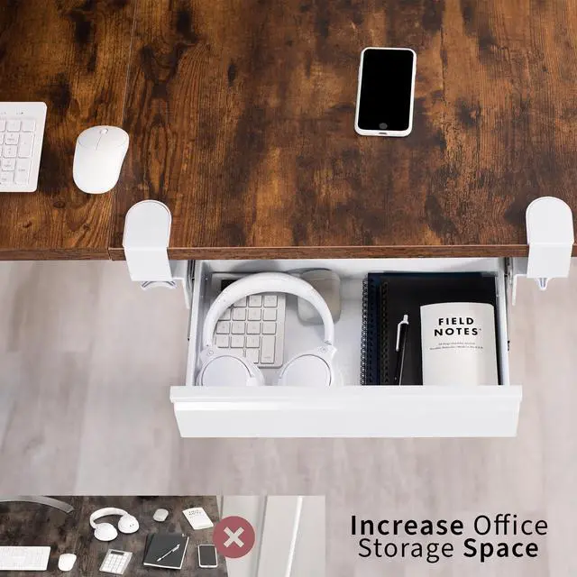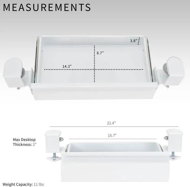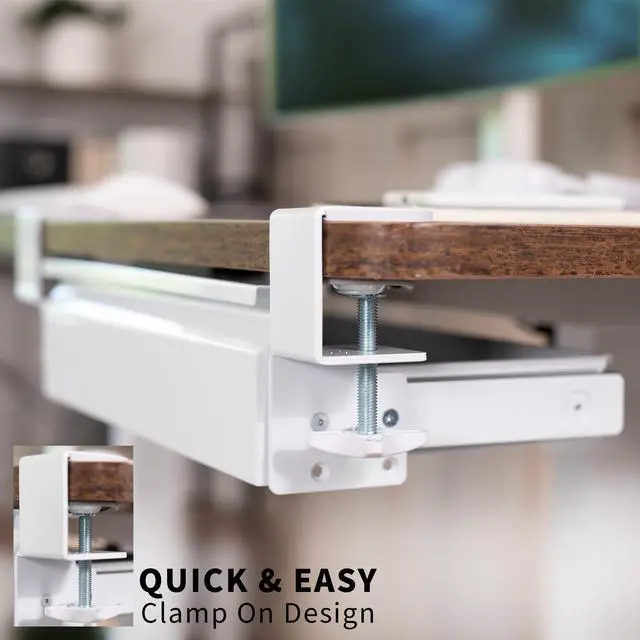 Declutter your workstation and enjoy a clean space with the White Clamp-on Desk Drawer (DESK-AC03C-W) from VIVO! This sturdy product can hold a wide variety of items that might otherwise take up space on your desk. Sturdy C-clamps easily secure to your workstation without causing any damage to your desktop, and you can access your materials without disturbing office neighbors thanks to the quiet, smooth sliding mechanism. This versatile drawer is compatible with most types of desks and features 2 height settings to accommodate desktops up to 2 thick. The sleek, steel design blends well with a majority of environments whether at home or in the office and holds up to 11 lbs. Minimal assembly and installation are required, so you can start storing your materials in no time!