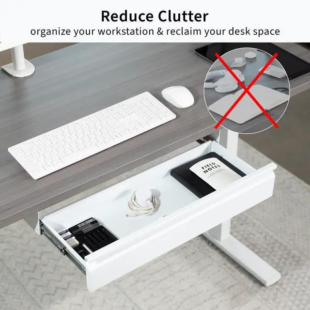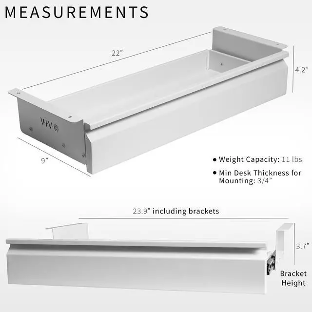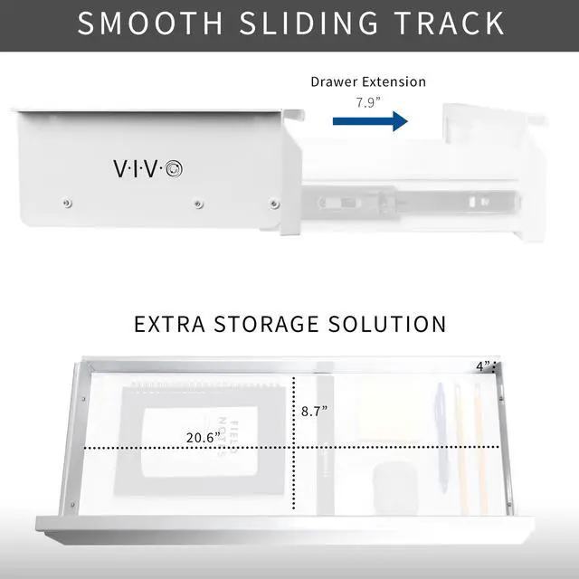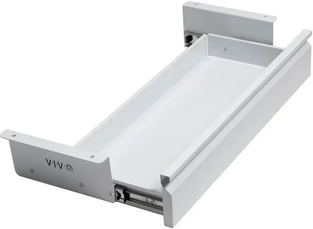 Declutter your workstation and enjoy a clean space with the 22 White Extra Wide Under Desk Drawer without Shell (DESK-AC03A-22W) from VIVO! This sturdy product can hold a wide variety of items that might otherwise take up space on your desk. Access your materials without disturbing office neighbors thanks to the quiet, smooth sliding mechanism. This versatile drawer is compatible with most types of desks measuring at least 3/4 in thickness and able to hold up to 18.4 lbs (drawer supports 11 lbs and weighs 7.4 lbs). The sleek, steel design blends well with a majority of environments whether at home or in the office. This product requires minimal assembly and installation, so you can start storing your materials in no time!