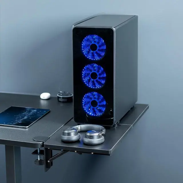 Extend your desktop and create more usable space with the Black Clamp-on 30" x 12" Desk Extension (DESK-EXT30) from VIVO! Finally have room for everything on your desk with an extender that serves as a platform for keyboards, speakers, printers, or added storage to your setup. The surface sits flush with your desktop, providing a level plane with seamless transition. The sturdy C-clamps anchor the tray for a solid writing surface, and you can attach it to the front, side, or back of your desk without fear of damage. When not in use, this tray can fold down 90 degrees for easy storage with the simple release levers. All hardware and instructions are included for a quick and easy setup!