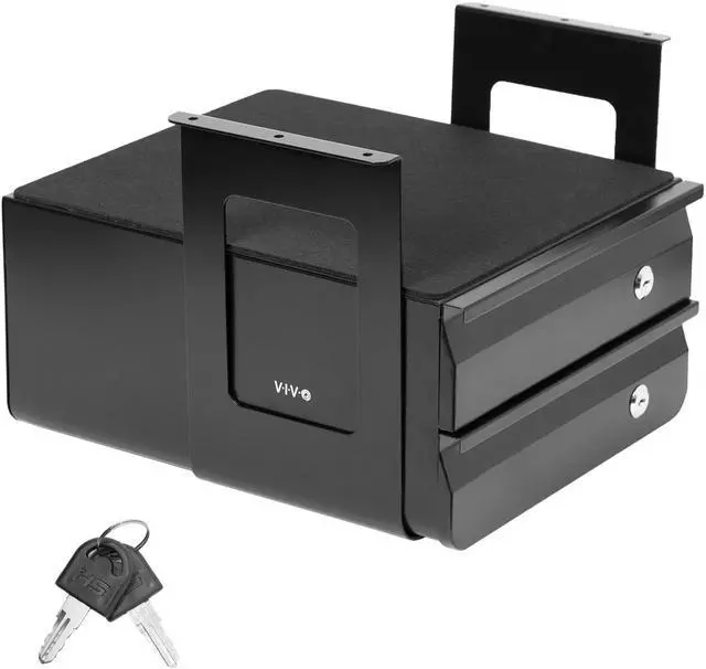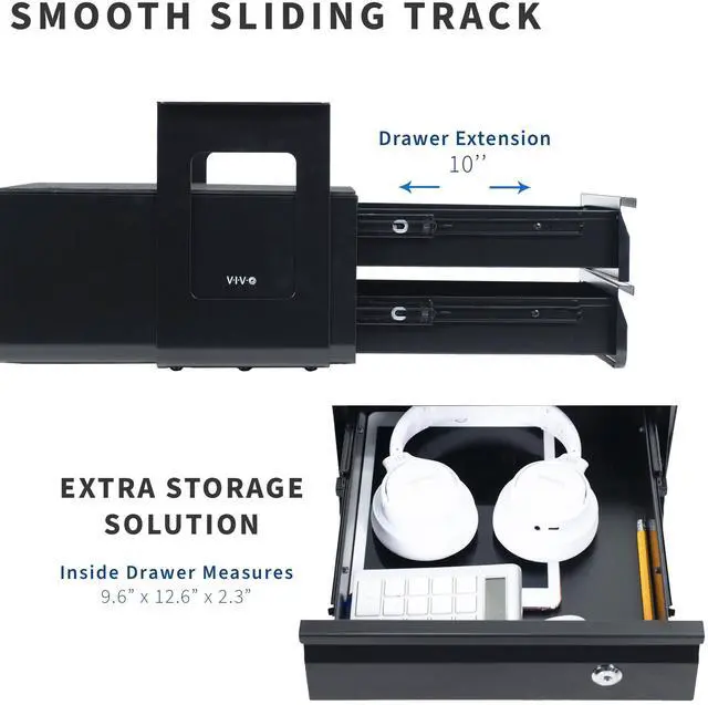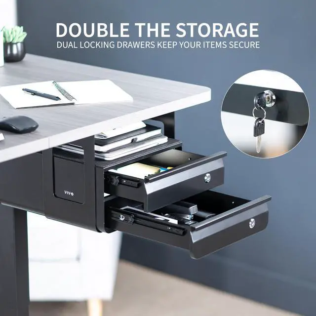 Cluttered workstations are a thing of the past with the Black Lockable Under Desk Double Drawer (DESK-AC03L-2B) from VIVO! This sturdy product can hold a wide variety of items that would otherwise require space on your desk. The solidly built drawers feature smooth sliding mechanisms that quickly and quietly lets you access your supplies, and the locking feature keeps your personal belongings and confidential documents safe and secure. Its compatible with most types of desks measuring at least 3/4 in thickness and able to hold up to 24.5 lbs (drawer system supports 11 lbs and weighs 13.5 lbs). The sleek, modern design complements a majority of home and office environments, and minimal assembly is required out of the box. With your new storage drawers, you can enjoy a clean and organized workspace!