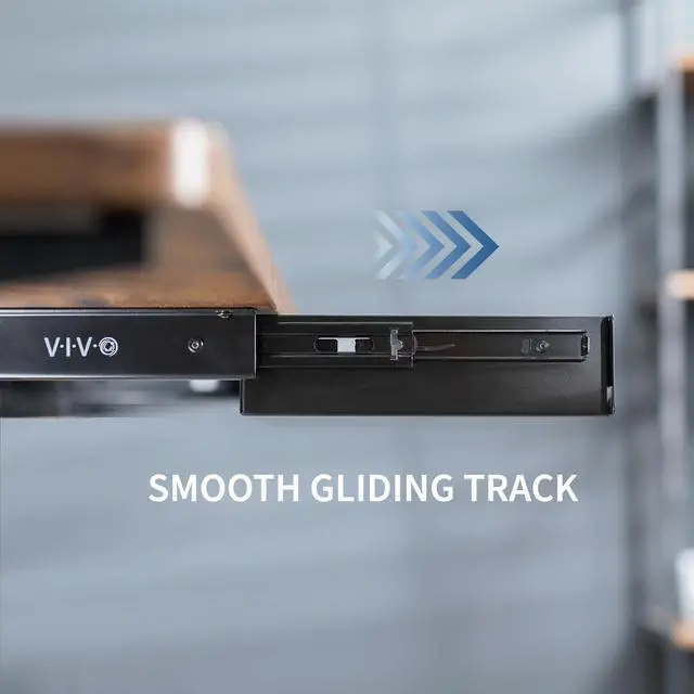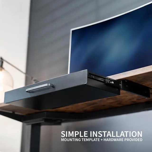 Declutter your workstation and enjoy a clean space with the Black 22" Under Desk Drawer with Pull Handle (DESK-DR22H-B) from VIVO! This sturdy product can hold a wide variety of items that might otherwise take up space on your desk. Access your materials without disturbing office neighbors thanks to the quiet, smooth sliding mechanism, and the sleek front handle lets you pull the drawer in and out effortlessly. This versatile drawer is compatible with most types of desks measuring at least 0.75 in thickness and able to hold up to 16.3 lbs (drawer supports 11 lbs and weighs 5.3 lbs). The sleek, steel design blends well with a majority of environments whether at home or in the office. This product requires minimal assembly and installation, so you can start storing your materials in no time!