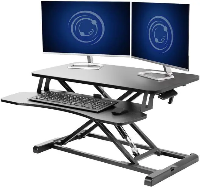 Experience the freedom to think on your feet with the Black 32" Desk Riser (DESK-V000K) from VIVO! Transitioning between sitting and standing throughout the long work day provides numerous health benefits for the body such as increased blood flow and reduced aches and pains. This solidly built desktop supports up to 33 lbs, easily holding dual monitors or laptop and monitor combinations. It also features pneumatic spring lift allowing simple and smooth height adjustment (4.5 to 20) at the squeeze of a handle. The dual-tiered design allows you to customize your work area for maximum comfort, and the keyboard tray is removable anytime you want additional space. All hardware and instructions are provided so you can get your new desk riser assembled and workspace organized in no time!