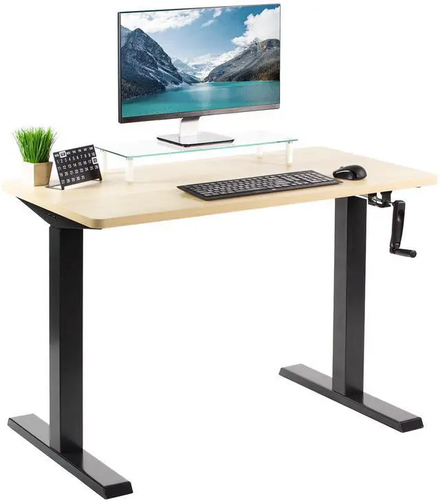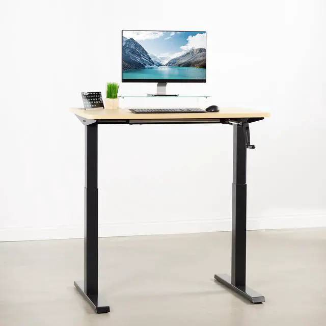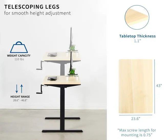 Transform your workstation to accommodate an active work life with the Light Wood / Black 43 x 24 Manual Height Adjustable Desk (DESK-KIT-MB4C) from VIVO! Finding a healthy balance between sitting and standing throughout the long work day is made possible with manual height adjustment, telescopic legs, and an easy-to-use hand crank. The sturdy table top provides room for dual-monitor setups and important supplies so you can organize your workspace to fit your preferred layout. With a frame constructed of solid steel, this desk easily supports up to 110 lbs and is built to last. All necessary hardware and instructions are provided, so you can get your new workstation assembled and taking your processes to new heights!