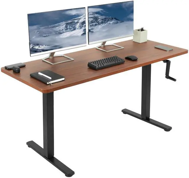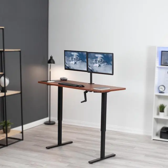 Transform your workstation to accommodate an active work life with the Dark Walnut / Black 60" x 24" Manual Height Adjustable Desk (DESK-KIT-MB6D) from VIVO! Finding a healthy balance between sitting and standing throughout the long work day is made possible with manual height adjustment, telescopic legs, and an easy-to-use hand crank. The spacious table top provides room for dual monitor setups and important supplies so you can organize your workspace to fit your preferred layout. With a frame constructed of solid steel, this desk easily supports up to 110 lbs and is built to last. All necessary hardware and instructions are provided, so you can get your new workstation assembled and taking your processes to new heights!