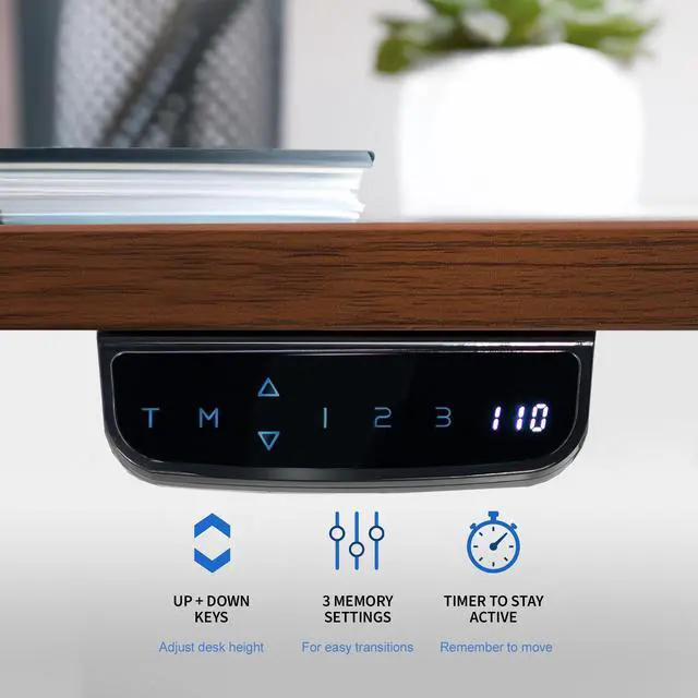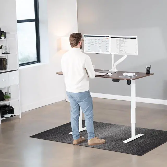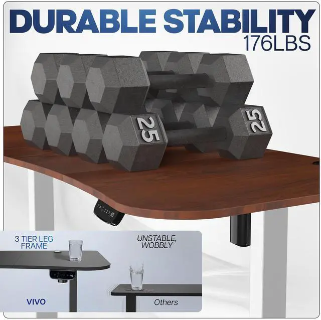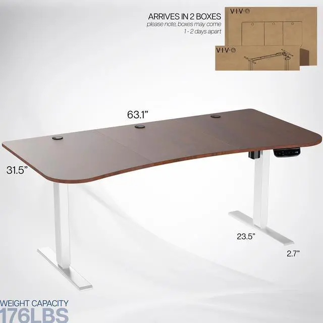 Transform your workstation to accommodate an active work life with the Dark Walnut / White 63" x 32" Electric Desk (DESK-KIT-2EWD) from VIVO! Find that healthy balance between sitting and standing throughout the long work day with electric adjustment, 3-stage telescopic legs for extra height, and an elegant touch-screen controller featuring memory presets and a timer reminder. With a frame constructed of solid steel, this desk supports up to 176 lbs and is built to last. The table top has a curved, modern shape with cable management openings and comes packaged in 3 sections. All hardware is provided to get the desk frame put together and installed to the desktop in no time!