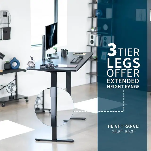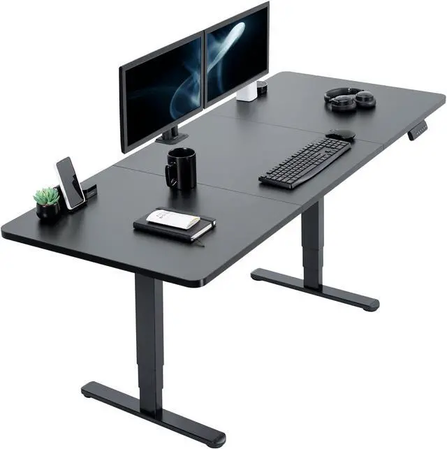 Transform your workstation to accommodate an active work life with the Black 71" x 30" Electric Desk (DESK-KIT-2B7B) from VIVO! Finding a healthy balance between sitting and standing throughout the long work day is made possible with electric height adjustment, telescopic legs, and a simple push-button controller featuring 3 memory presets. The spacious table top provides room for dual monitor setups and important supplies so you can organize your workspace to fit your preferred layout. With a frame constructed of solid steel, this desk supports up to 220 lbs and is built to last. All hardware and instructions are provided, so you can get your new workstation assembled and taking you to new heights!
