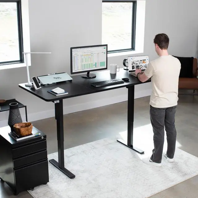 Transform your workstation to accommodate an active work life with the Black 71" x 30" Electric Desk (DESK-KIT-0B7B) from VIVO! Finding a healthy balance between sitting and standing throughout the long work day is made possible with electric height adjustment, telescopic legs, and a simple 2 button control panel. The spacious table top provides room for dual monitor setups and important supplies so you can organize your workspace to fit your preferred layout. With a frame constructed of solid steel, this desk supports up to 154 lbs and is built to last. All hardware and instructions are provided, so you can get your new workstation assembled and taking you to new heights!