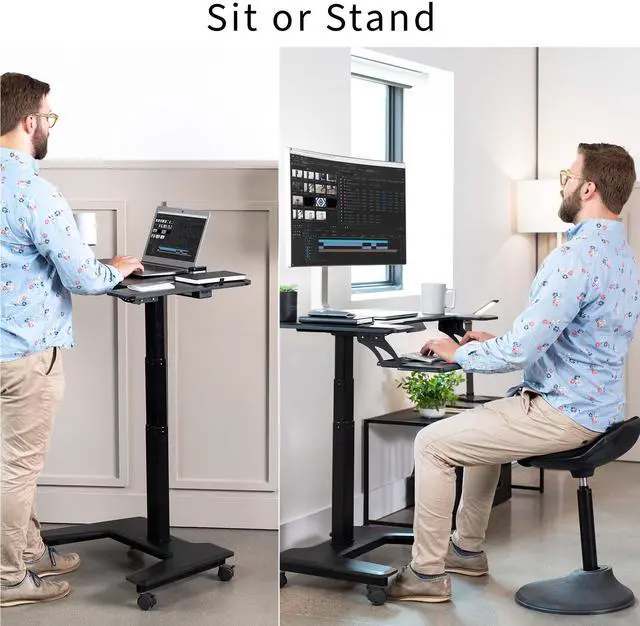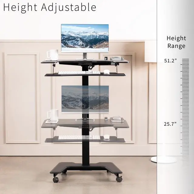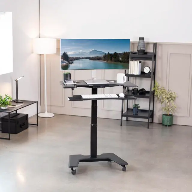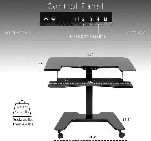 Increase the ergonomic comfort and mobility of your workstation while saving valuable space with the Black Electric Mobile Compact Desk (DESK-V111VT) from VIVO! Some offices and rooms are just not big enough to fit a large work desk. But thanks to this new electric motor-powered height adjustable desk, you can fit your monitors, keyboard, mouse, and additional equipment all at an ergonomic viewing position. The four durable caster wheels allow this desk to move from location to location with ease for optimal mobility. The top surface can fit two monitors of varying sizes with room to spare thanks to its 36" x 22" size, while the second tray holds your mouse and keyboard. The solid steel construction enables this standing desk to support up to 88 pounds (keyboard tray holds 4.4 pounds) and ensures that it will last and keep your workspace sturdy. All hardware and instructions are provided, so you can use your new sit-to-stand workstation in no time!