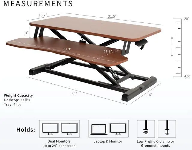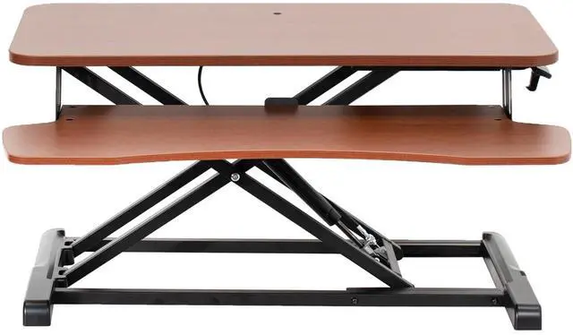 VIVO's wood colored height adjustable dual-tiered platform (DESK-V000KA) sits on top of your current desk and gives you the benefit of standing or sitting when desired. Switching between sitting and standing throughout a long work day provides several health benefits for the body such as increased blood flow and enhanced posture.Standing throughout the day also keeps the mind alert and productive while you work. The top platform rests 4.5" from your desk surface in the lowest position and elevates up to 20". Most of the desk comes assembled out of the box. Simply attach the keyboard with the included hex tool, and your desk is ready to go! The 30" x 16" base takes up minimal depth of desk while providing excellent balance at any height setting. The bottom is padded to prevent sliding and scratching.
