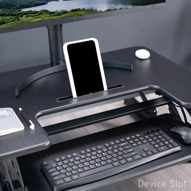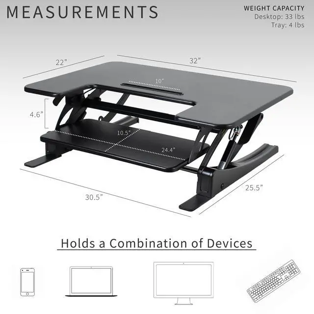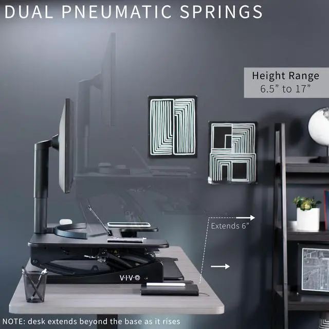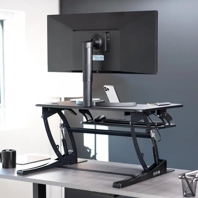 Enhance your work experience with the Black 32 Desk Riser (DESK-V000VS) from VIVO! This dual-tiered platform sits on top of your current desk and gives you the benefit of standing or sitting on demand. The keyboard tray is removable for user preference. Transitioning between sitting and standing throughout the long work day provides numerous benefits such as increased blood flow and reduced muscle tension. Standing throughout the day also helps the mind stay alert and productive. Counterbalance tension adjusts to the weight of your desk and everything on it for easy upwards movement. Find your perfect height level with unlimited adjustment points between 6.5 and 17 from the desk surface.