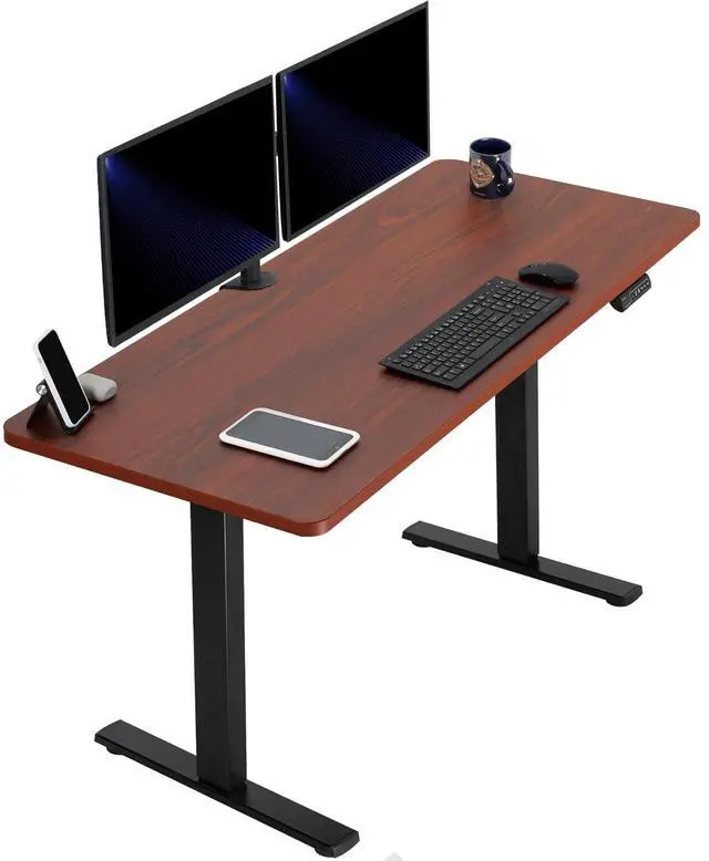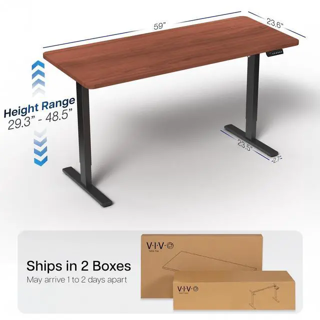 Transform your workstation to accommodate an active work life with the Dark Walnut / Black 60" x 24" Electric Desk (DESK-KIT-1B6D) from VIVO! Finding a healthy balance between sitting and standing throughout the long work day is made possible with electric height adjustment, telescopic legs, and a simple push-button controller featuring 4 memory presets. The spacious table top provides room for dual monitor setups and important supplies so you can organize your workspace to fit your preferred layout. With a frame constructed of solid steel, this desk supports up to 220 lbs and is built to last. Cable management clips keep cords and cables neatly organized and hidden from view for a tidy workspace that encourages concentration. All hardware and instructions are provided, so you can get your new workstation assembled and experience your very own standing desk in no time!
