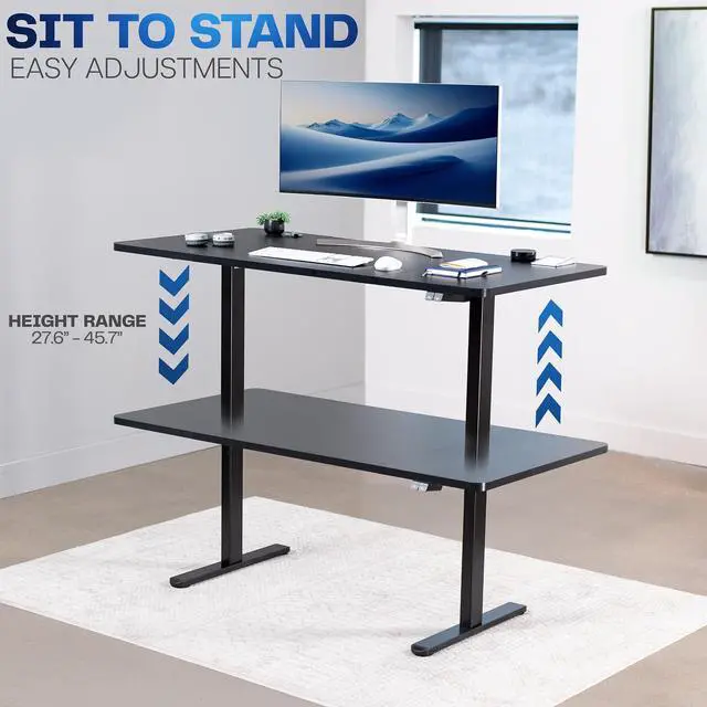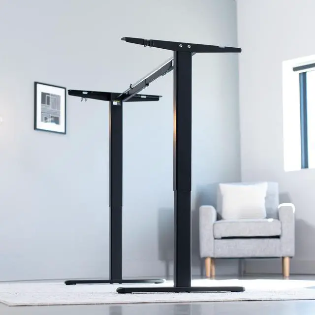 Create your own standing workstation and be able to sit or stand on demand throughout the long work day with Black Electric Single Motor Desk Frame (DESK-V100EB) from VIVO! Adjust your desks height in seconds with this sturdy frame featuring a single motor lift system for smooth transitions, a simple 2 button controller, adjustable feet, and solid leg support for desk surfaces weighing up to 154 lbs. The thermal motor is protected against overheating to ensure this desks safety and longevity. An integrated cable management system keeps cords clean and organized so they dont interfere with height transitions. We include all the necessary hardware and instructions for assembly, so you can complete your very own ergonomic workstation with a solid frame that supports your equipment and lets you think on your feet!