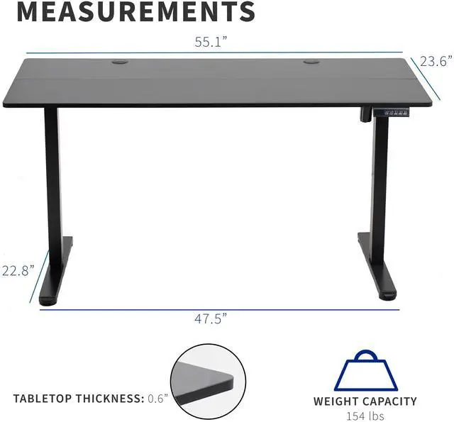 Enjoy an active work life with the Black 55" x 24" Electric Desk (DESK-E155TB) from VIVO! Finding a healthy balance between sitting and standing throughout the long work day is made possible with electric height adjustment, telescopic legs, and a simple push button controller with 3 memory presets. The spacious table top provides room for dual-monitor setups and important supplies so you can organize your workspace to fit your preferred layout. With a frame constructed of steel, this desk supports up to 154 lbs and is built to last. All necessary hardware and instructions are provided, so you can get your new workstation assembled and taking you to new heights!