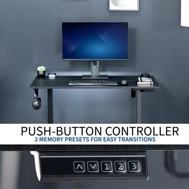 Transform your workstation to accommodate an active work life with Black Electric Desk (DESK-E144B) from VIVO! Finding a healthy balance between sitting and standing throughout the long work day is made possible with electric height adjustment, telescopic legs, and a simple push button controller with 3 memory presets. The desk also features cable management, overload and heat protection, and adjustable feet that adapt to most any floor surface. The spacious table top provides room for dual monitor setups and important supplies so you can organize your workspace to fit your preferred layout. With a frame constructed of steel, this desk supports up to 154 lbs and is built to last. All necessary hardware and instructions are provided, so you can get your new workstation assembled and taking you to new heights!