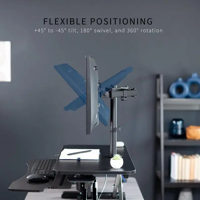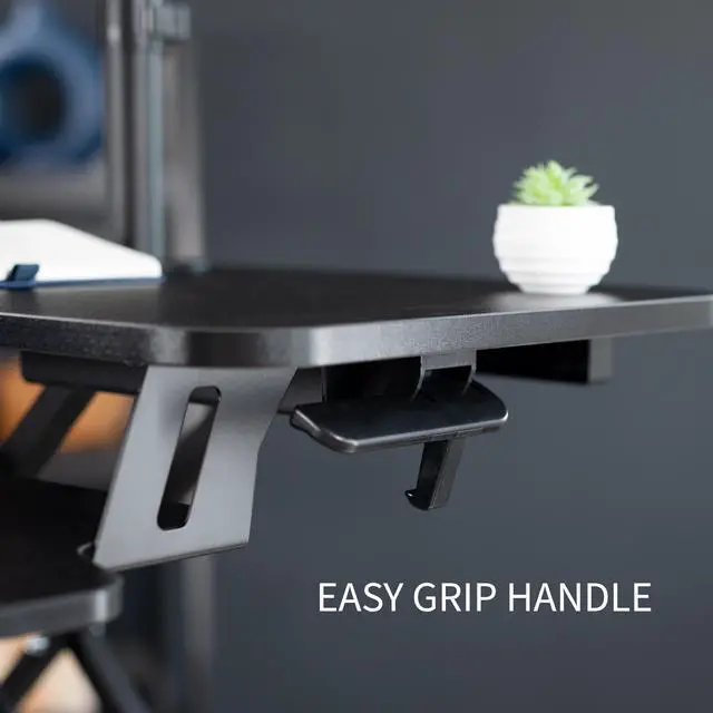 Create your own active workstation with the Black Desk Riser with Dual Monitor Mount (DESK-V000K-M2) from VIVO! Transitioning between sitting and standing throughout the long work day provides numerous health benefits for the body such as increased blood flow and reduced aches and pains. This solidly built desk riser allows you to make height transitions at the squeeze of a handle, and the dual monitor stand attaches to your riser via sturdy grommet mount for additional height adjustment options and comfortable viewing angles. All hardware and instructions are provided so you can get your new desk riser and monitor stand assembled in no time!