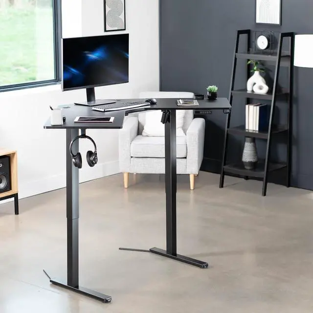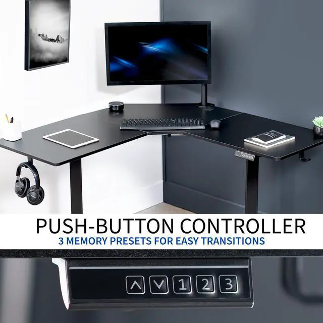 Enjoy a spacious workstation that accommodates an active work life with the Black Corner Electric Desk (DESK-E1L94B) from VIVO! Periodically standing throughout the long work day helps relieve tension on the neck, back, and shoulders while increasing blood flow and reducing stress. Enjoy being able to stand up in seconds with this corner workstation featuring a powerful motor lift system for smooth height transitions, a simple push button controller with 3 memory presets, and solid legs supporting up to 154 lbs. The cable management system ensures that cords and cables are neatly organized for a tidy workspace that encourages concentration. All hardware and instructions are provided for assembly, so you can experience your own active desk in no time!
