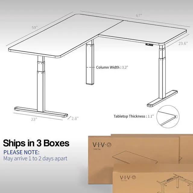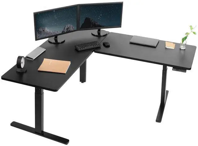 Enjoy a spacious workstation that accommodates an active work life with the Black Corner 67 x 60 Electric Desk (DESK-KIT-3E6B) from VIVO! Periodically standing throughout the long work day can help relieve tension on the neck, back, and shoulders, as well as increase blood flow and reduce stress. Enjoy being able to stand up in seconds with this sturdy l-shaped desk featuring a multi-motor lift system for smooth height transition, a control panel for customizable settings, and solid legs supporting up to 300 lbs. The cable management system ensures that cords and cables are neatly organized for a tidy workspace that encourages concentration. All hardware and instructions are included for assembly. Dont wait to experience your own spacious work area that helps you stay organized and think on your feet!